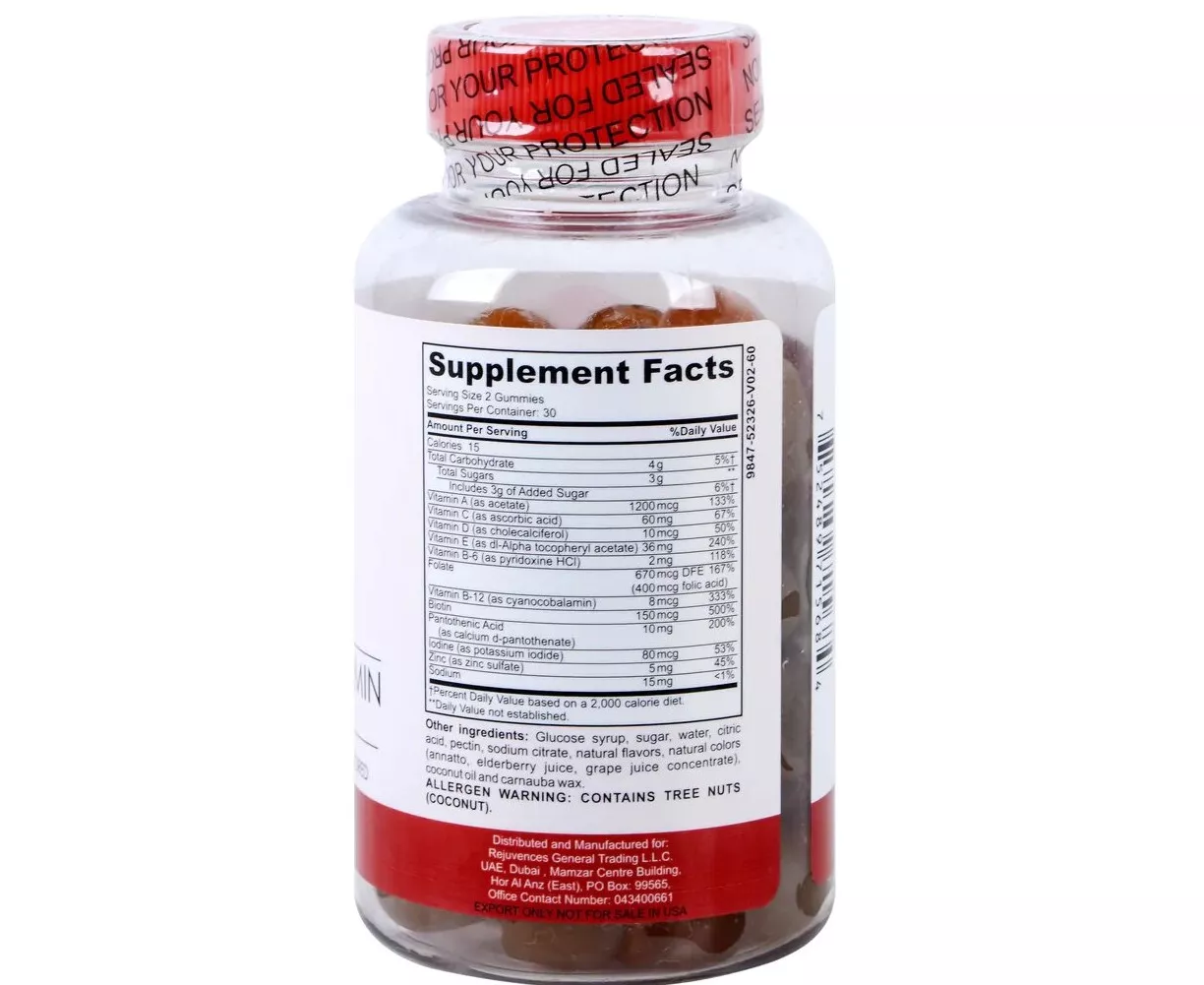 • Rejuvences vitamin gummies for kids are made using the highest-quality ingredients. Each gummy consists of a delicious and healthy combination of vitamins a, c, d, e, b6, b12, biotin, iodine, sodium, zinc, and folate.