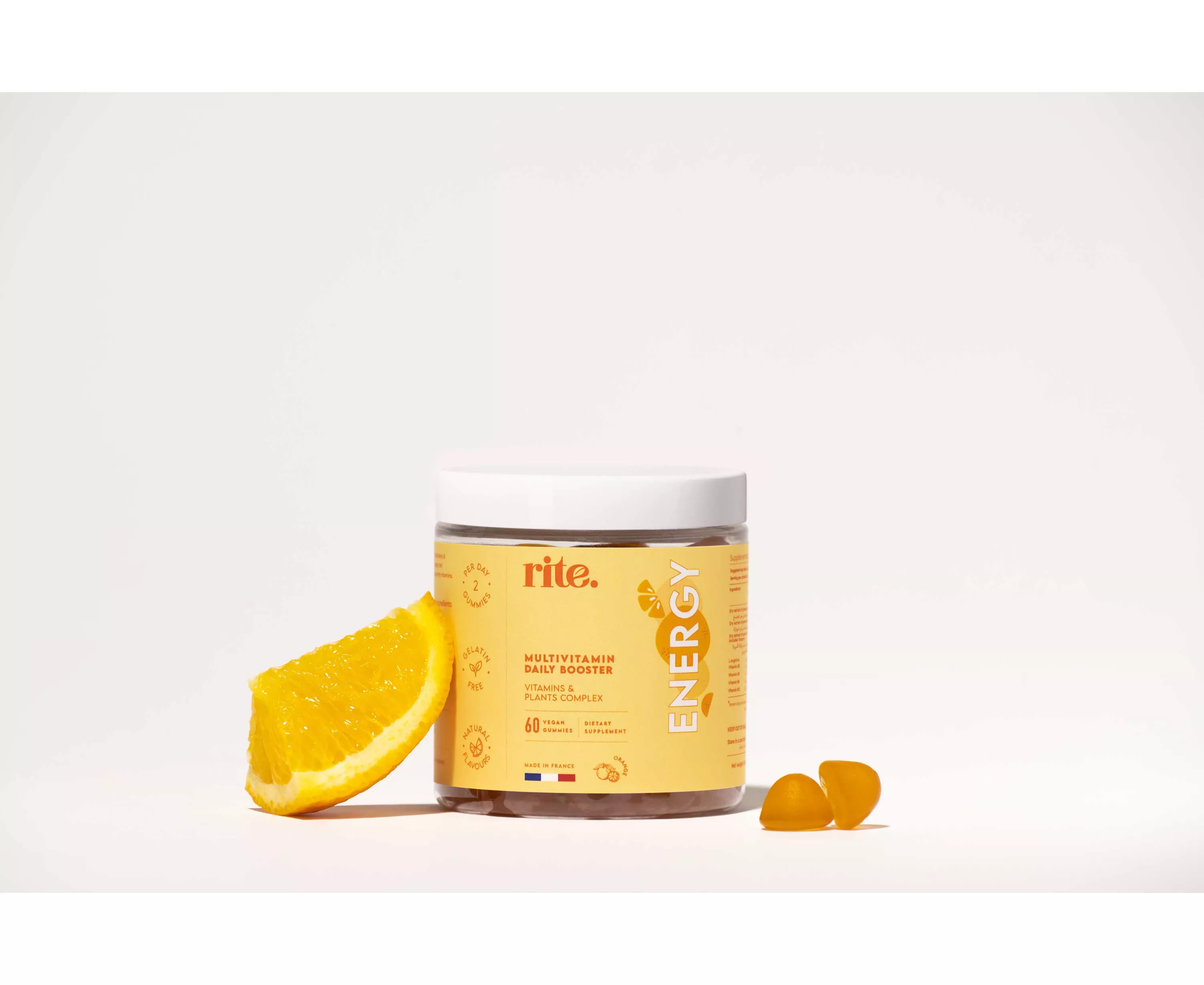 Glucose syrup – sugar - gelling agent: pectin - dry extract of acerola fruit (malpighia punicifolia l.) - natural orange flavour - dry extract of guarana seed (paullinia cupana kunth) - acidifier: citric acid – l-arginine - nicotinamide (vitamin b3) - dry extract of ginseng root (Panax ginseng) - calcium d-pantothenate (vitamin b5) - paprika extract - coating agent: carnauba wax, vegetable oils (contains coconut oil and rapeseed oils) and antioxidant: alpha-tocopherol - pyridoxine chlorohydrate (vitamin b6) - cyanocobalamin (vitamin b12).