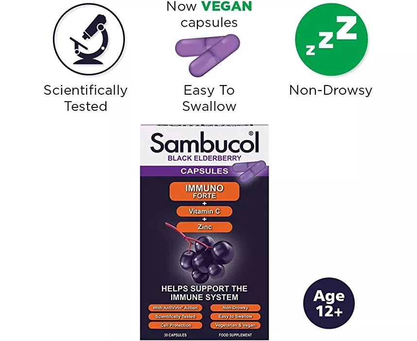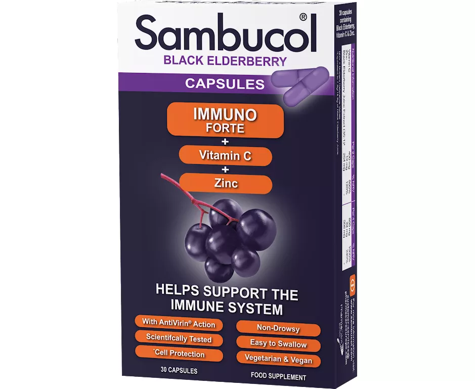 Family immune support - Sambucol immune forte capsules contain black elderberries as well as vitamin c and zinc to help strengthen the immune system. Easy to swallow, natural & non-drowsy - Sambucol is a range of immune-boosting food supplements founded on the unique qualities of black elderberries. Sambucol Immuno forte capsules are ideal for those who don’t like liquids or want a high-strength immune support format that’s easy to carry around.