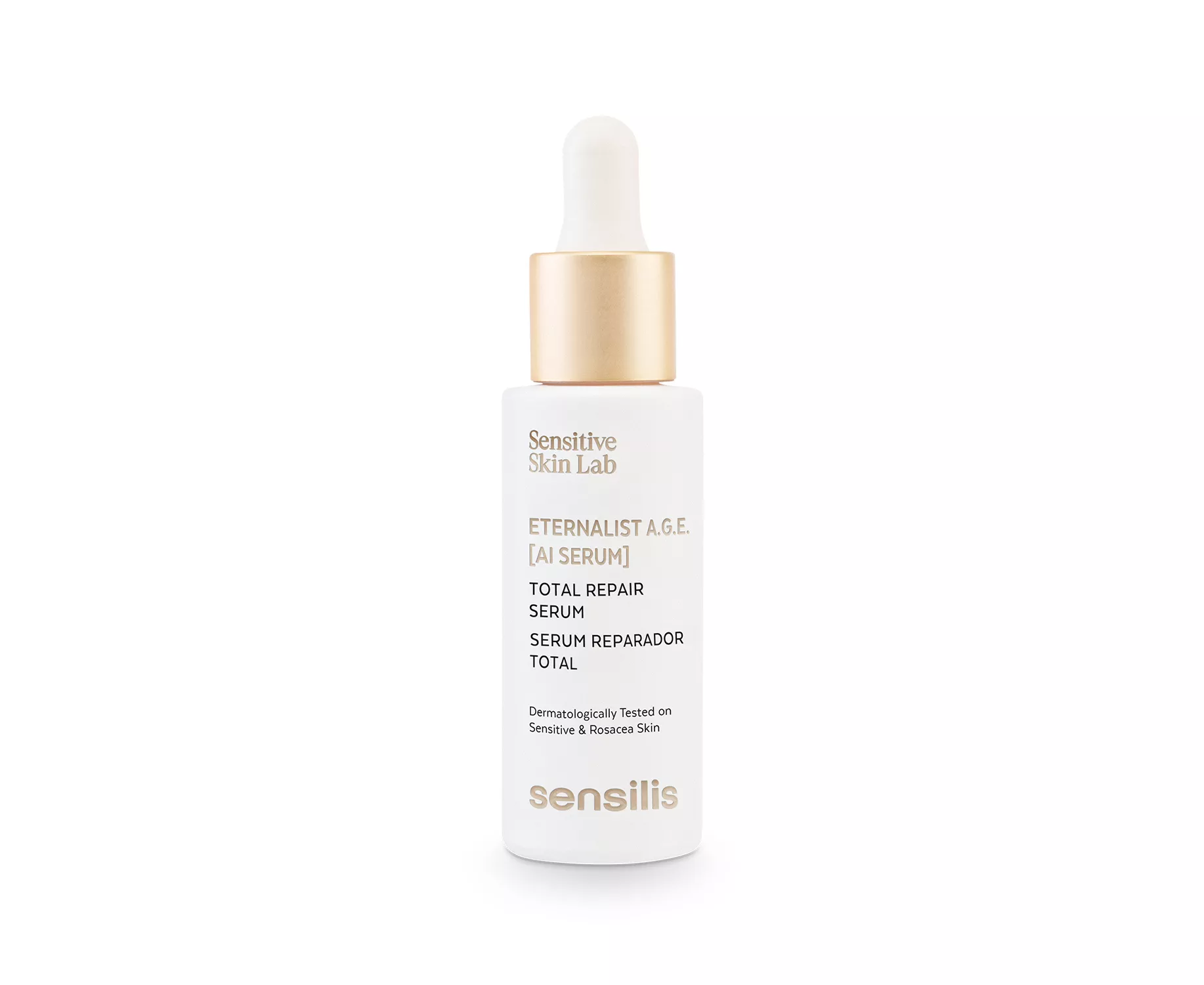 Apply a few drops of Sensilis Eternalist A.G.E. [Serum AI] Total Repair Serum onto the hands and then distribute it evenly over the face and neck.