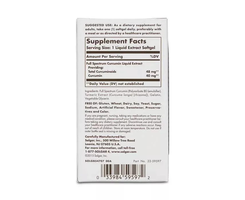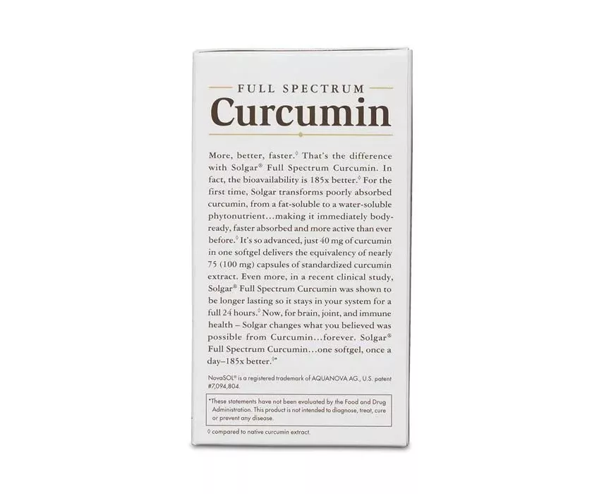 More, better, faster. That's the difference with Solgar Full Spectrum Curcumin. In fact, the bioavailability is 185x better. For the first time, Solgar transforms poorly absorbed curcumin, from a fat-soluble to a water-soluble phytonutrient... making it immediately body-ready, faster absorbed and more active than ever before. It's so advanced, just 40 mg of curcumin in one softgel delivers the equivalency of 75 (100 mg) capsules of standardized curcumin extract. Even more, in a recent clinical study, Solgar Full Spectrum Curcumin was shown to be longer lasting so it stays in your system for a full 24 hours.Now, for the brain, joint and immune health - Solgar changes what you believed was possible from curcumin...forever. Solgar Full Spectrum Curcumin... one soft gel, once a day- 185x better.