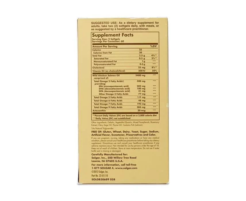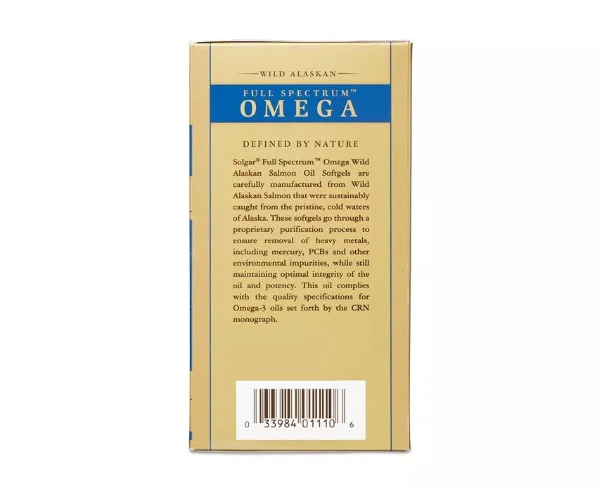 Solgar Full Spectrum Omega Wild Alaskan Salmon Oil Softgels are carefully manufactured from Wild Alaskan Salmon that were sustainably caught from the pristine, cold waters of Alaska. These softgels go through a purification process to ensure removal of heavy metals, including mercury, while still maintaining optimal integrity of the oil and potency.