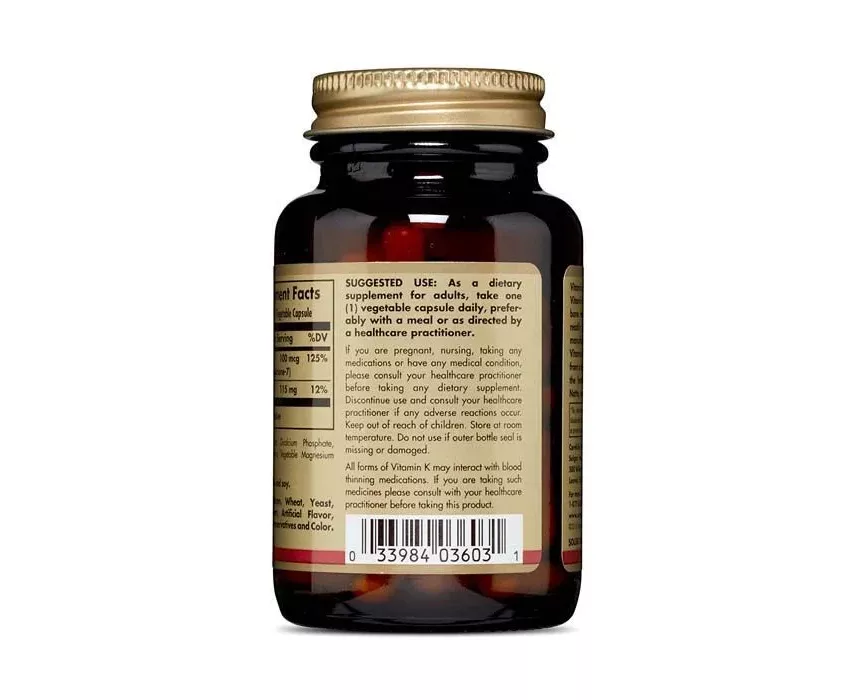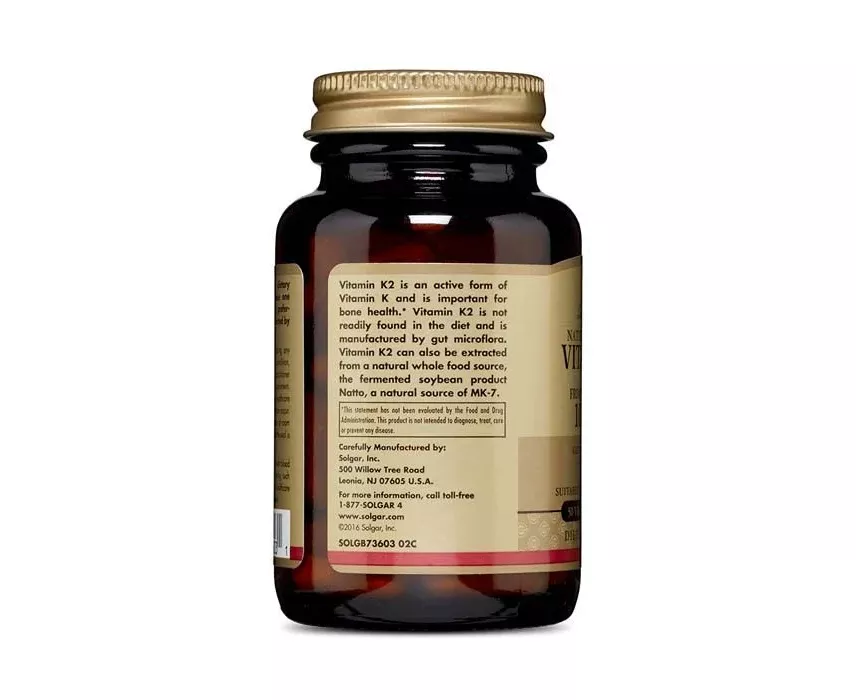 Solgar ® Natural Vitamin K2 (MK-7) 100 µ Vegetable Capsules utilizes the highly bioavailable natural form of Vitamin K, Menaquinone-7. Long known to play an important role in bone building and blood clotting. This unique vitamin K is derived from natto, a traditional Japanese fermented food, known to be rich in vitamin K and with a long history as a superfood