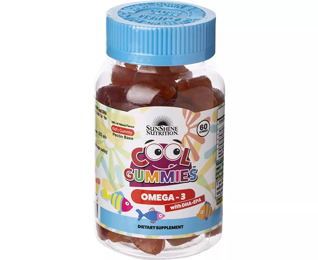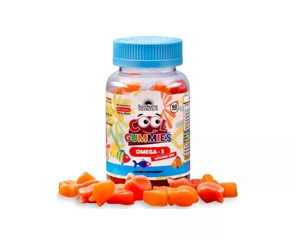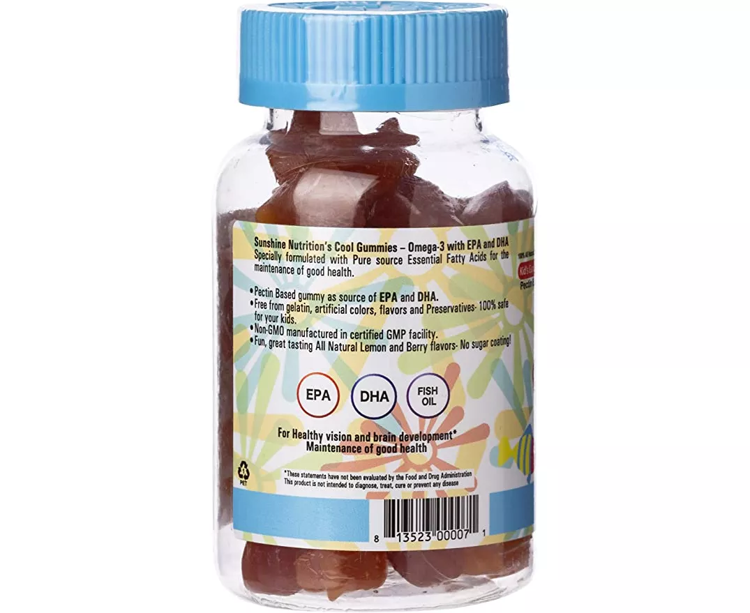 Sunshine Nutrition's Cool Gummies Omega -3 offers a healthy, convenient and delicious way for kids to supplement their diet with omega-3 fatty acids - both EPA (Eicosapentanoic acid) and DHA (Docosapentanoic acid). Omega 3 - Supports healthy vision and brain development. Key to developing the central nervous and cardiovascular system; Boosts immunity. Specially formulated with Pure source Essential Fatty Acids for the maintenance of good health. Pectin Based gummy as source of EPA and DHA. Free from gelatin, artificial colors, flavors and Preservatives- 100% safe for your kids. Non-GMO manufactured in certified GMP facility. Fun, great tasting All Natural Lemon and Berry flavor - No sugar coating!