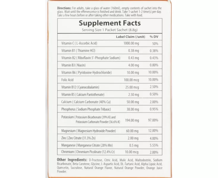 D-fructose, citric acid, malic acid, maltodextrin, sodium bicarbonate, beta carotene, glycine, l-aspartic acid, dl-tartaric acid, alpha lipoic acid, quercetin, sucralose, natural orange flavor, natural orange powder, orange juice powder.