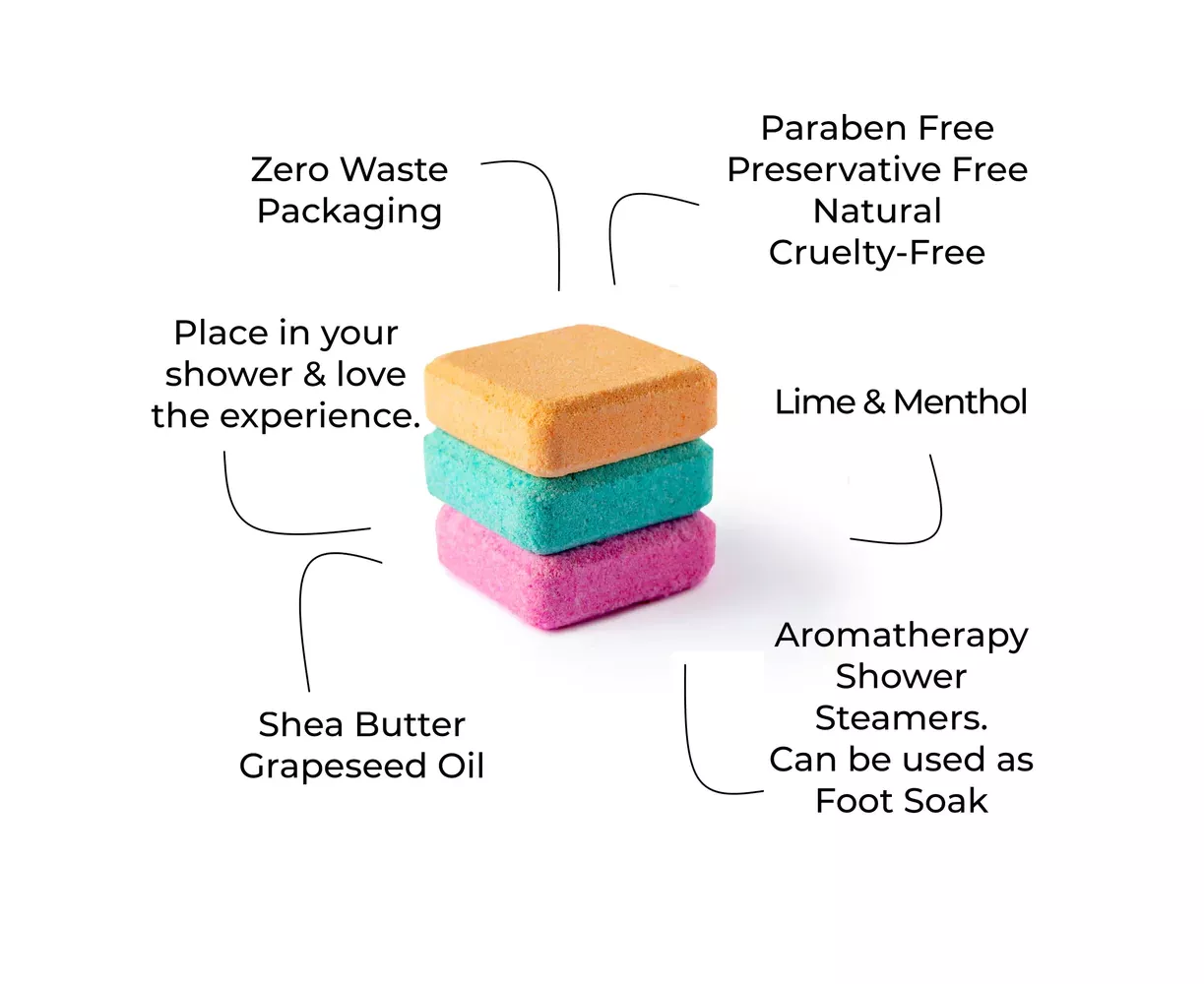 To use a shower steamer, turn on your shower on high heat water and simply place one tablet at the foot of your shower in a stream of water. As the tablet gets wet it dissolves and releases essential oils and menthol into the hot shower steam. Allow the steam to build up for 2 minutes then step in and enjoy your lime and menthol infused shower. Breathe deeply to clear your breathing pathway.