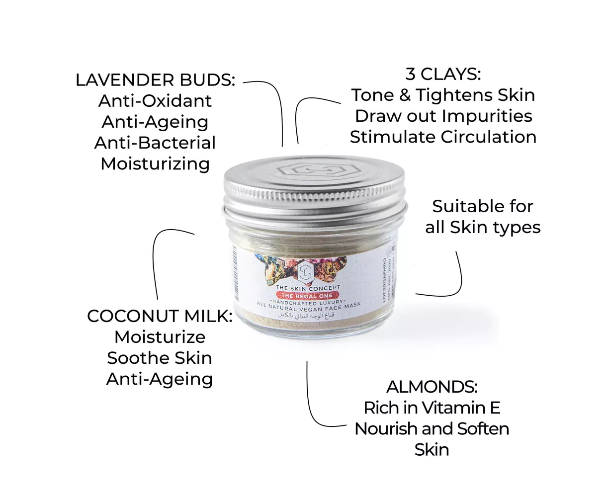 THREE CLAYS: French Green Clay, Kaolin Clay, Fuller's Earth-Draw out impurities from the skin, tone and firm skin, stimulate blood circulation, help heal blemishes.
