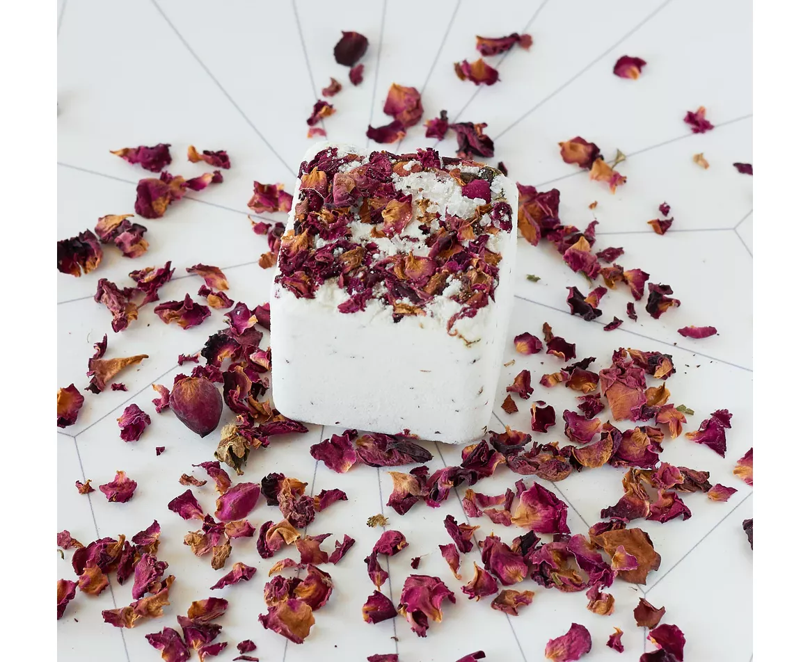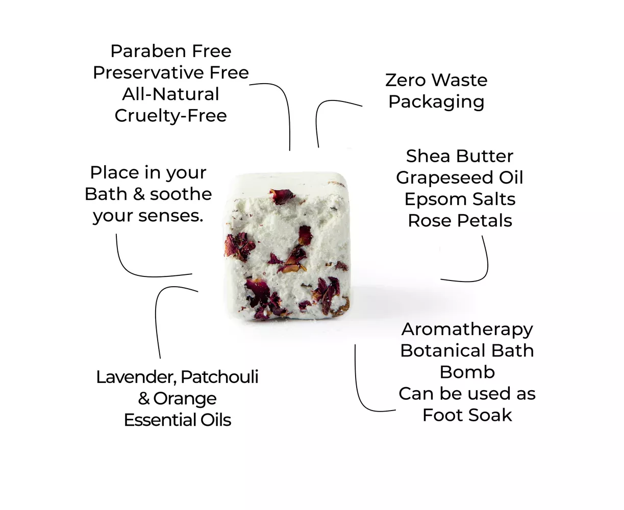 Our Relaxation Butter Bath Bomb is crafted with potent natural ingredients like Shea Butter, Cocoa Butter Kaolin Clay, Epsom Salt, Rose Petals, Witch Hazel & Lavender, Orange, Patchouli Essential Oils which have been used for centuries for their moisturizing, healing & calming benefits.