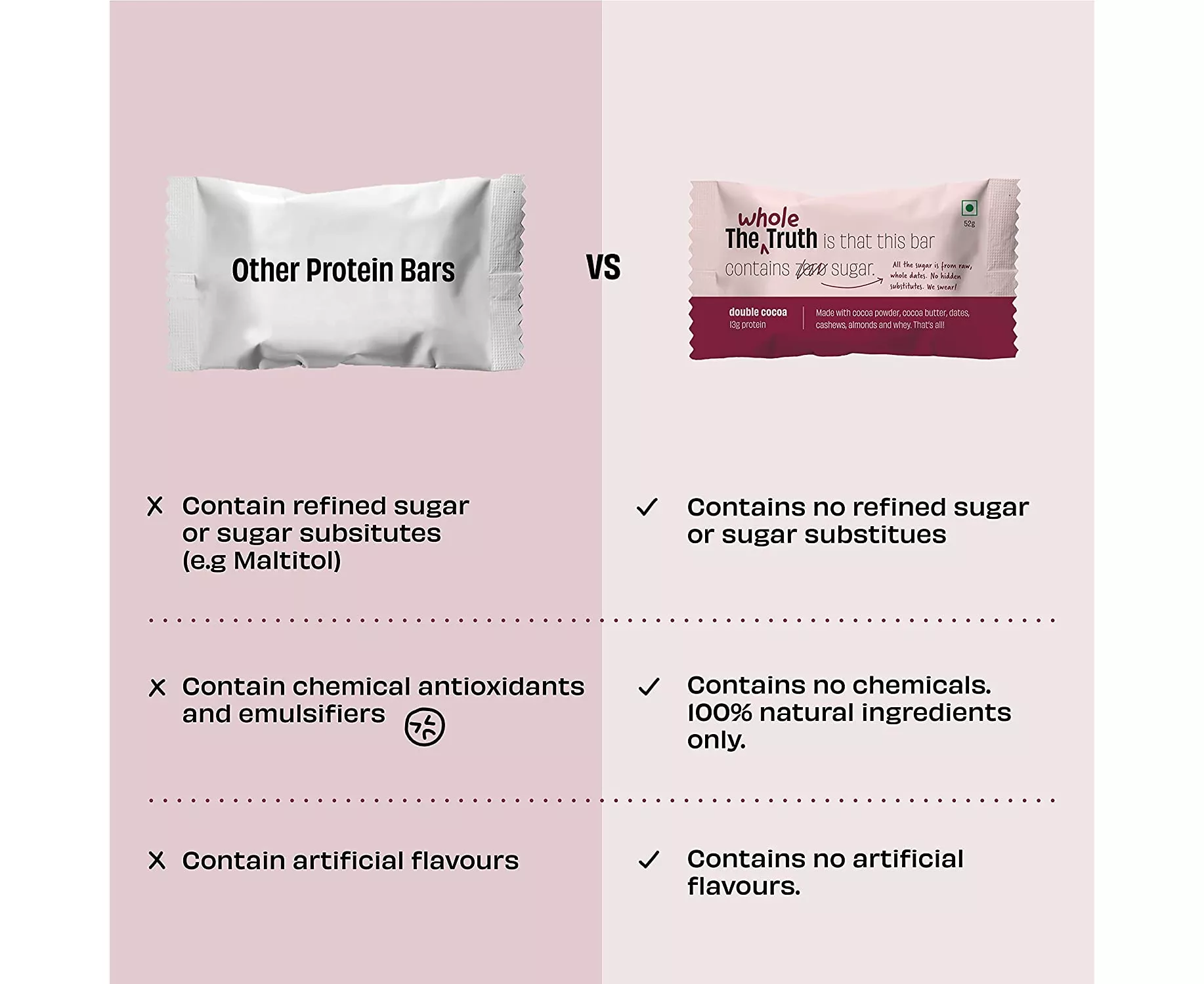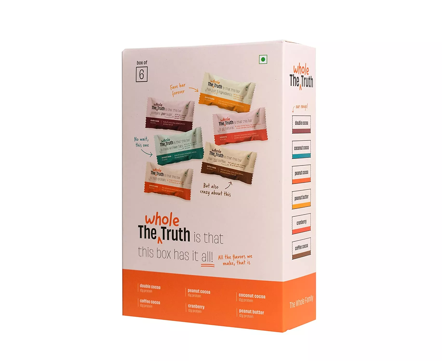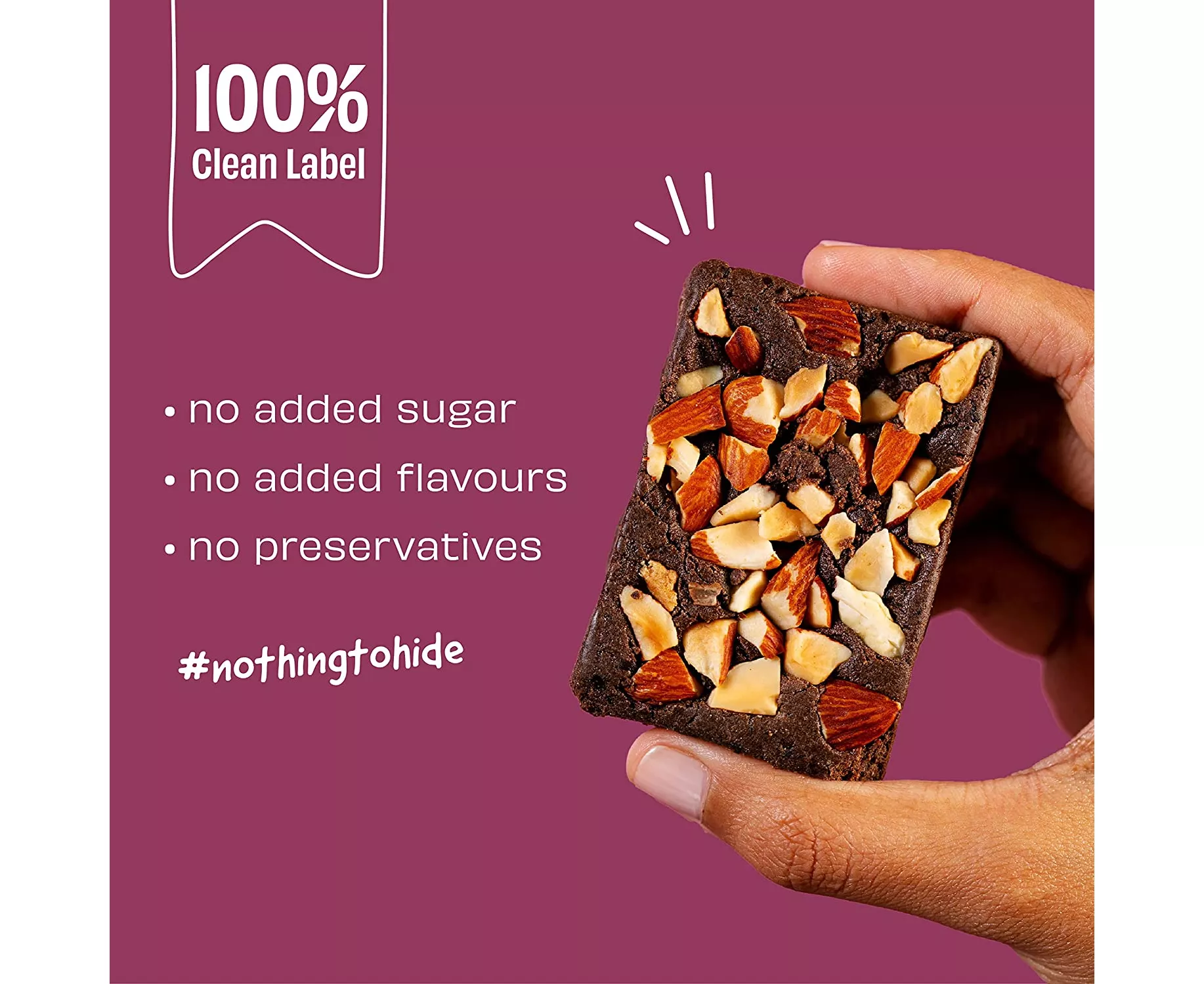 Healthy meets 'very' TastyDon't we all crave different things at different times? Dark fudgy chocolate one day, sweet tangy cranberries another day... who knows!? Sometimes all you need is a little bit of everything! Why force your choice, when you can actually have it All. In One. :) | 12-15g Veg Protein - For EveryoneIt's a myth that only gym-going men need protein. Expecting moms, growing kids, aging dads - they all do! And if they love nuts and dates - they'll love our bars. | Just 4-6 IngredientsOther brands hide their ingredients at the back, because they have something to hide. We declare all our ingredients proudly - upfront! | No bad stuffDoes your bar have Maltodextrin? Or Maltilol? Or FOS (fructo-oligosaccharides)? Why!? Well, we only make real food. With ingredients you can pronounce. Nothing made in a chemistry lab. |
