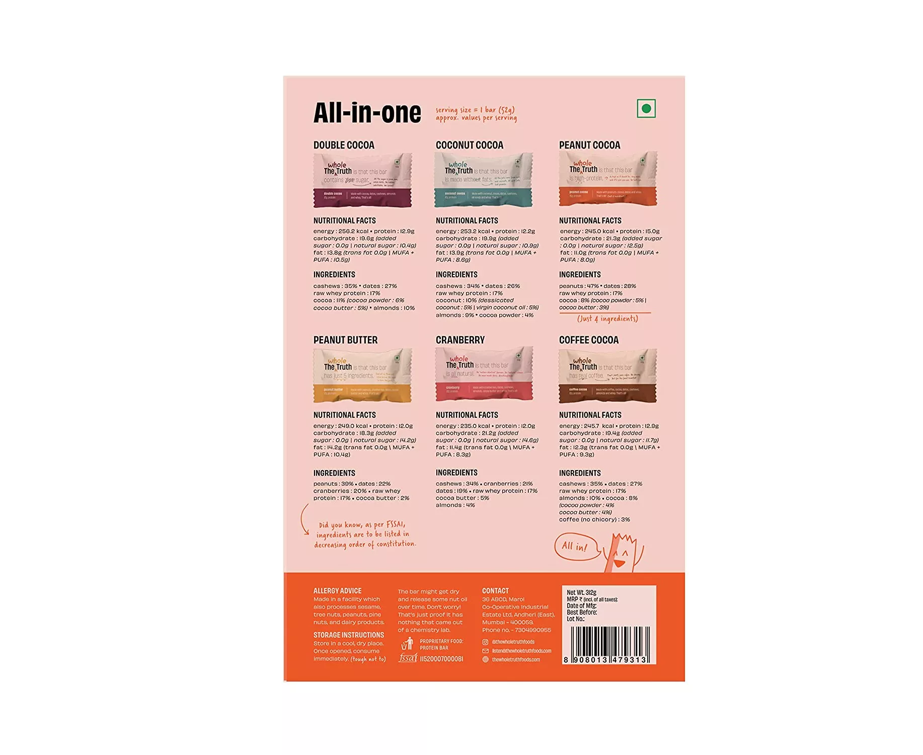 Double Cocoa - Cashew Nuts (35%), Dates (27%), Raw Whey Protein (17%), Cocoa (11%), Almonds (10%); Coconut Cocoa - Cashew Nuts (34%), Dates (26%), Raw Whey Protein (17%), Coconut (10%), Almonds (9%), Cocoa Powder (4%);. Coffee Cocoa - Cashew Nuts (35%), Dates (27%), Raw Whey Protein (17%), Almonds (10%), Cocoa (8%), Coffee (No Chicory) (3%); Peanut Butter - Peanuts (39%), Dates (22%), Cranberries (20%), Raw Whey Protein (17%), Cocoa Butter (2%). Cranberry - Cashew Nuts (34%), Cranberries (21%), Dates (19%), Raw Whey Protein (17%), Cocoa Butter (5%), Almonds (4%), Peanut Cocoa - Peanuts (47%), Dates (28%), Raw Whey Protein (17%), Cocoa (8%)