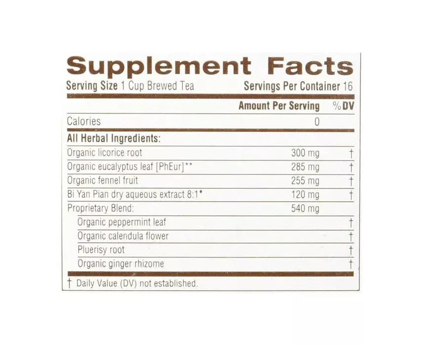 Organic licorice root Organic eucalyptus leaf (PhEur), Organic fennel fruit Bi Yan Plan dry aqueous extract 8:1, Proprietary Blend: Organic peppermint leaf, Organic calendula flower, Pluerisy root, Organic ginger rhizome.