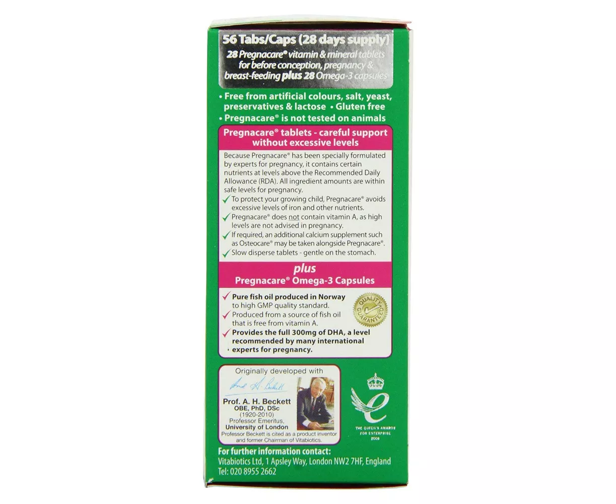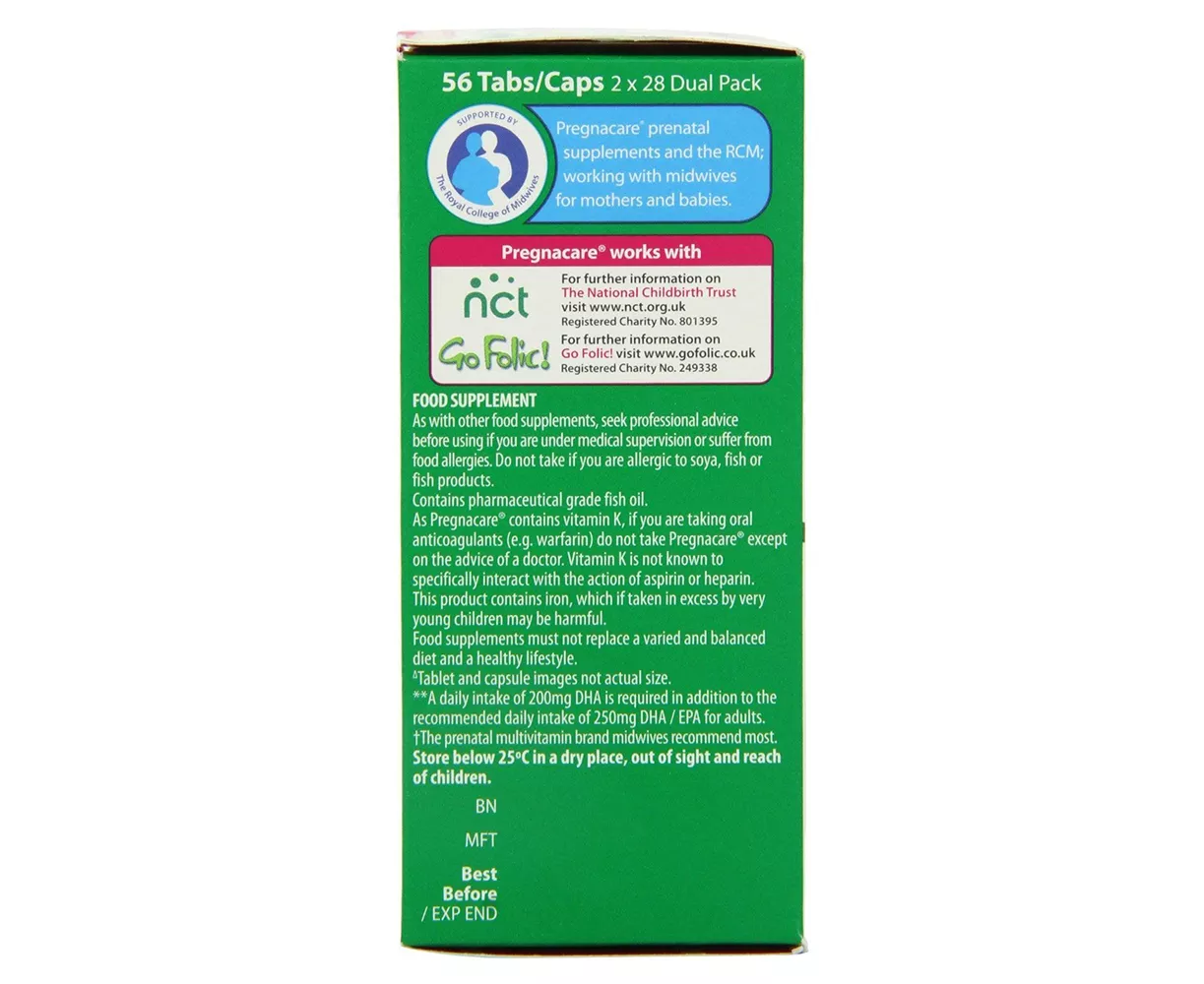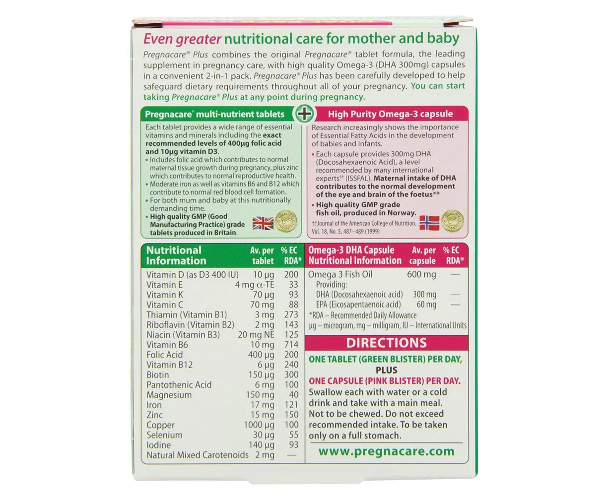 Pregnacare Plus offers necessary care during pregnancy and breast-feeding. It is specially formulated with the recommended levels of folic acid, vitamin D, Omega-3 and DHA for the development of brain and eye. It avoids excessive level of iron and other nutrients to pr4otect the growing child. This multi-nutrient tablets contains folic acid that contributes to the maternal tissue growth during pregnancy. Zinc supports the normal reproductive health.