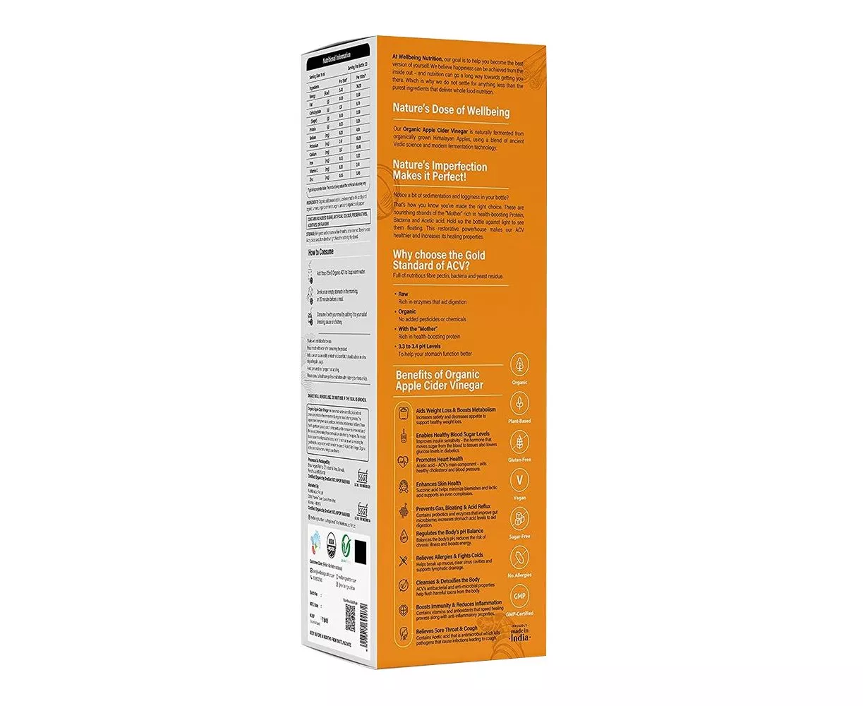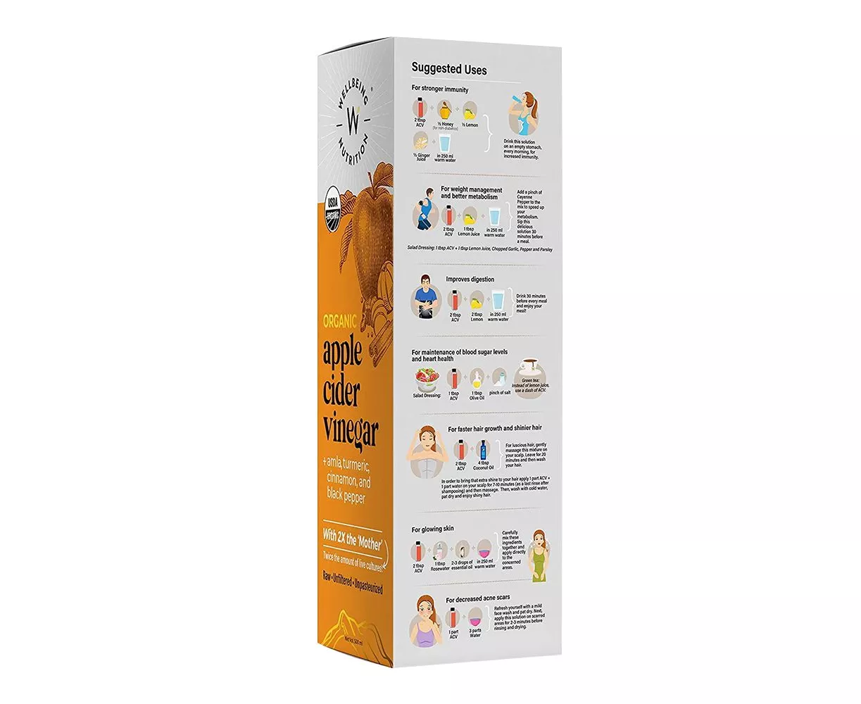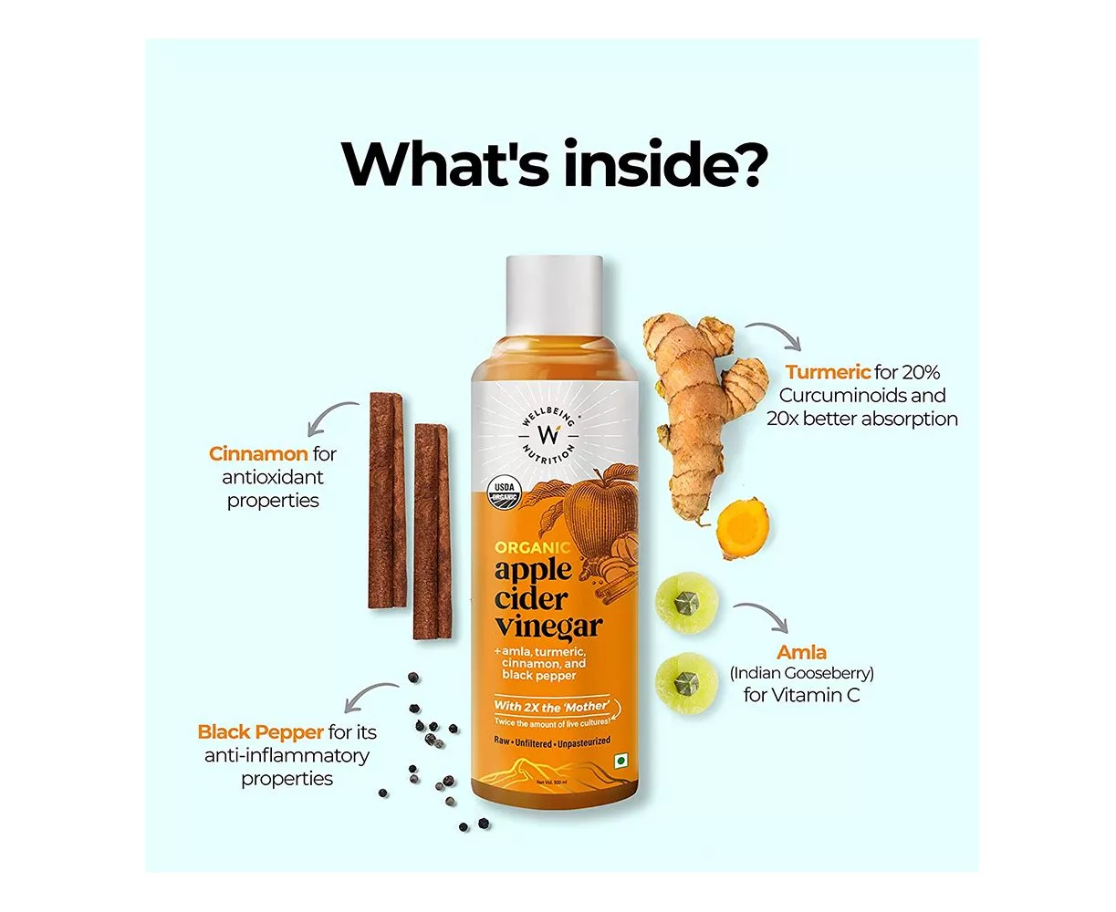 • Wellbeing Nutrition’s Organic Apple Cider Vinegar is a blend of handpicked Himalayan Gold and Red apples with the additional goodness of Amla, Turmeric, Cinnamon, and Black Pepper. Made using a combination of ancient Vedic science and modern fermentation technology, our ACV is raw, unfiltered, and unpasteurized, and contains 2x the ‘Mother’ – a colony of friendly bacteria that give your body essential proteins and enzymes. These extra ingredients in Wellbeing’s Apple Cider Vinegar not only double its detoxifying effects on the body, but also helps and supports in enhancing skin health, improving oral health.