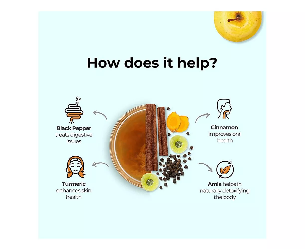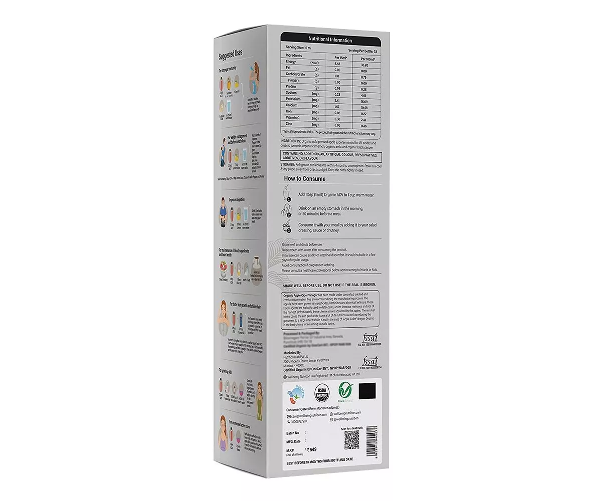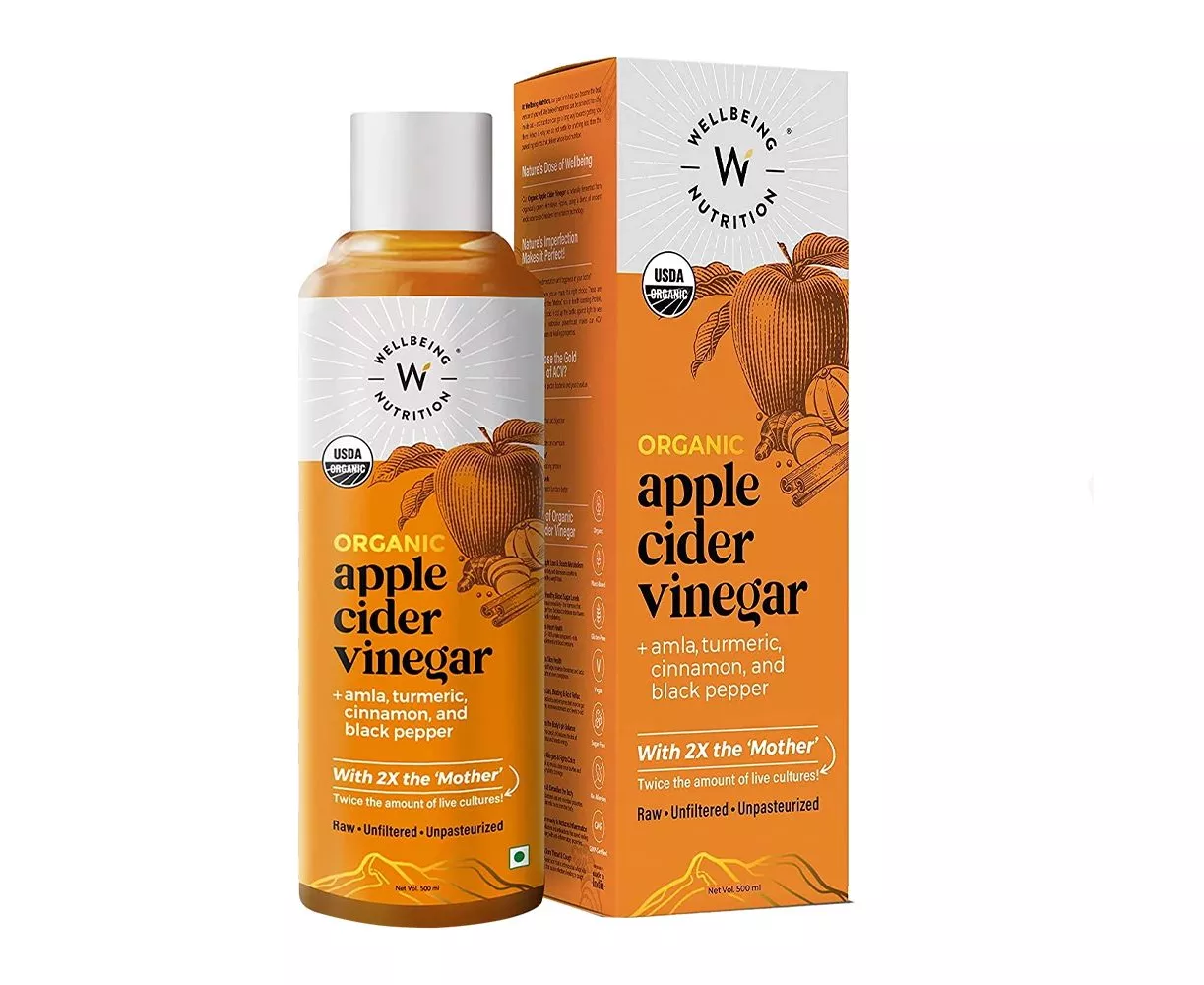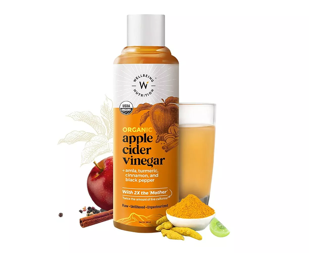 • Wellbeing Nutrition’s Organic Apple Cider Vinegar is a blend of handpicked Himalayan Gold and Red apples with the additional goodness of Amla, Turmeric, Cinnamon, and Black Pepper. Made using a combination of ancient Vedic science and modern fermentation technology, our ACV is raw, unfiltered, and unpasteurized, and contains 2x the ‘Mother’ – a colony of friendly bacteria that give your body essential proteins and enzymes. These extra ingredients in Wellbeing’s Apple Cider Vinegar not only double its detoxifying effects on the body, but also helps and supports in enhancing skin health, improving oral health.