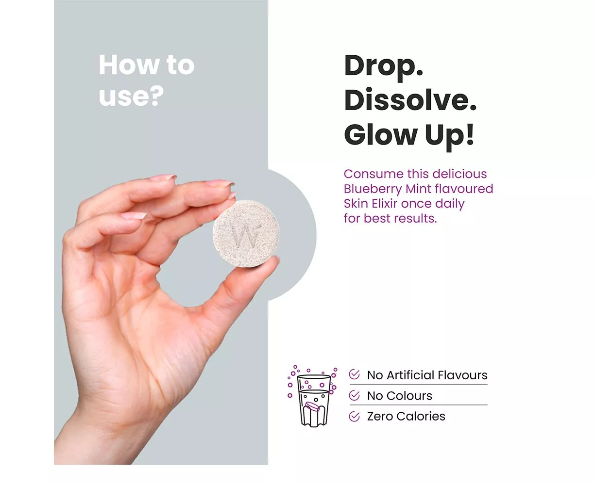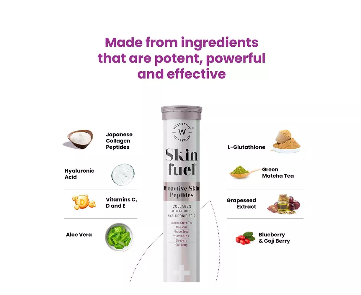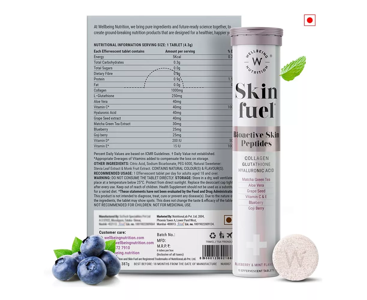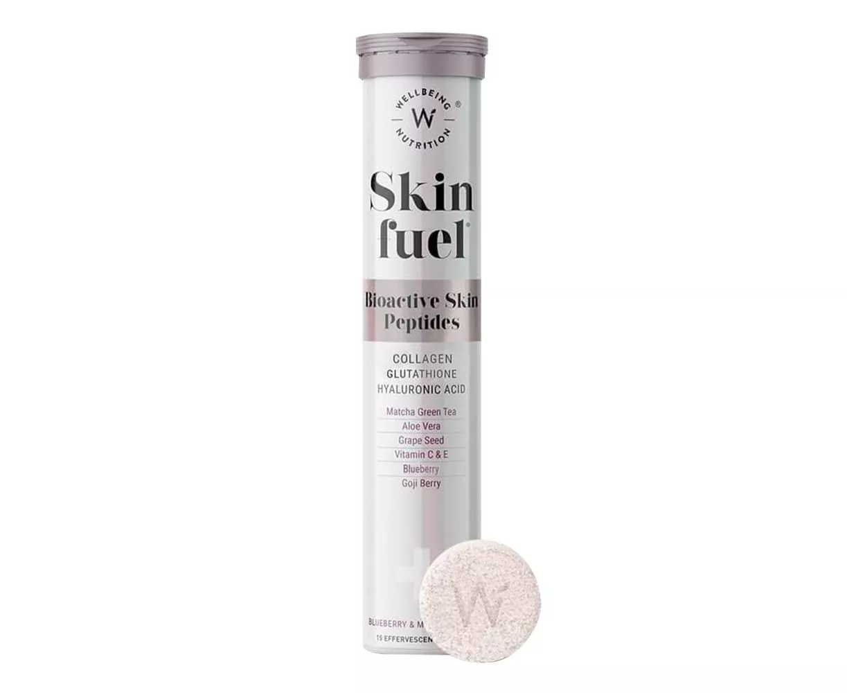 Wellbeing Nutrition Skin Fuel is the only collagen peptide drink that provides building blocks for nourished, firmer, and glowing skin from within. This delicious Blueberry Mint Skin Elixir counteracts age-related collagen loss to help improve skin texture and complexion, control pigmentation and discoloration, reduce acne and wrinkles, and give your skin a natural glow. The Wellbeing Nutrition Skin Fuel tablets made using naturally derived, widely researched ingredients to help you achieve skin radiance. It contains no artificial flavors, coloring and zero calories, and works wonders in repairing connective tissue, which helps give you stronger, healthier and faster-growing hair and nails too. One tube = 15 water-soluble tablets